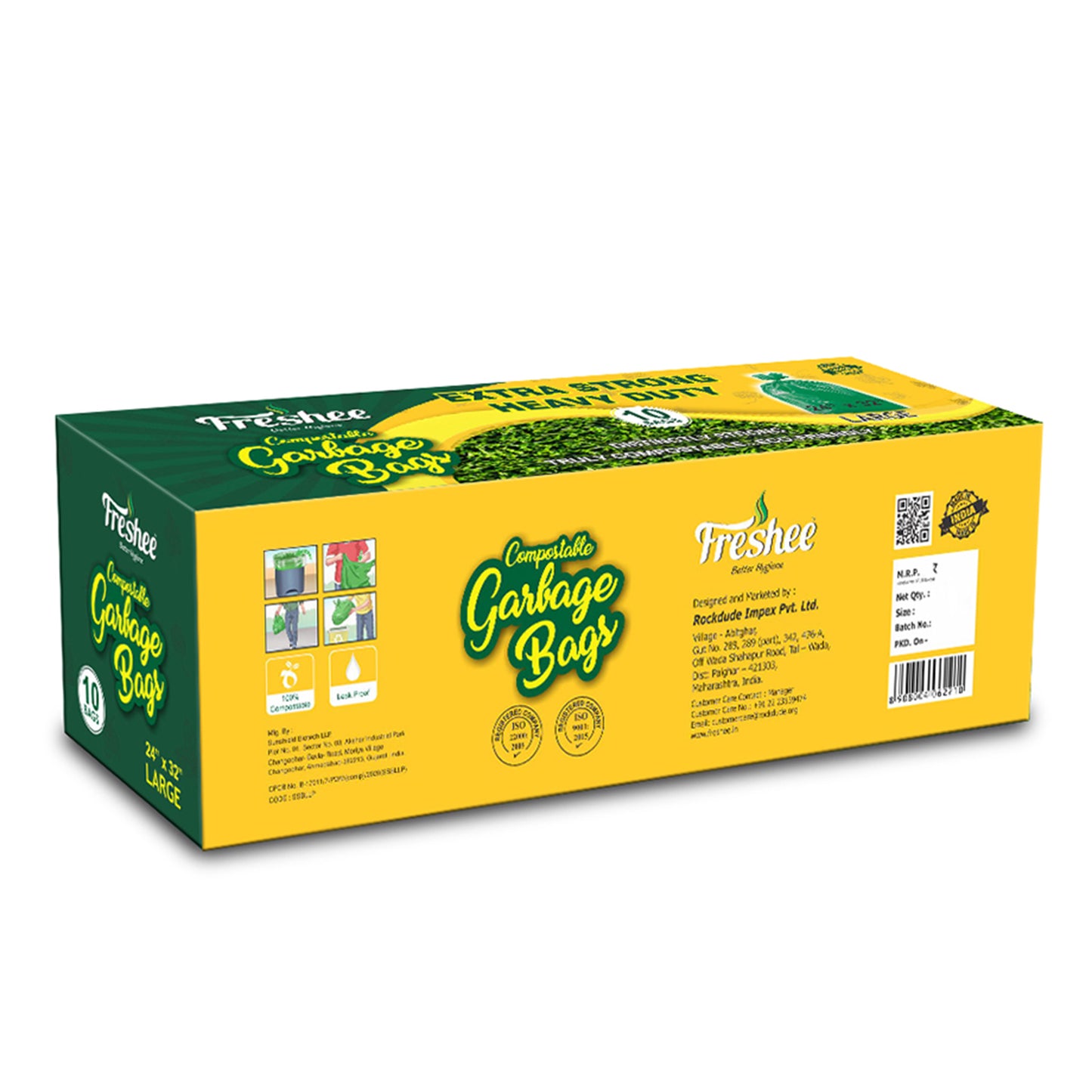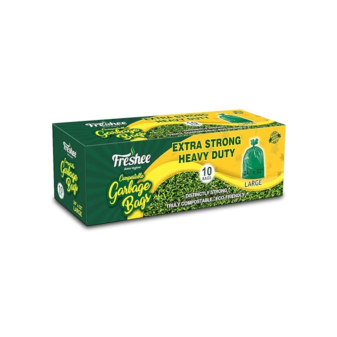 Freshee Garbage Bags come with a bunch of innovative features, the most important feature being it is completely compostable. Biodegradable garbage bags or compostable trash bags are an ideal way to prevent plastic pollution. The trash bags handle the most demanding jobs in the kitchen and throughout the house. These trash bags are strong and durable and help prevent a trash disaster at home. It is a convenient method of garbage disposal to maintain cleanliness and hygiene. Each package contains 1 roll with 10 bags. It comes with a perforation technology for quickly separating the bags from the roll. Can be used as a wastebasket bag for office, kitchen, living room, bedroom, bathroom, cleaning pet’s litter, baby diapers and garage. These trash bags can also store blankets, books and clothes according to season, and organize your holiday decorations, trash can liner for kitchen & office waste bin collection and exactly the right size for lining your garbage bins.